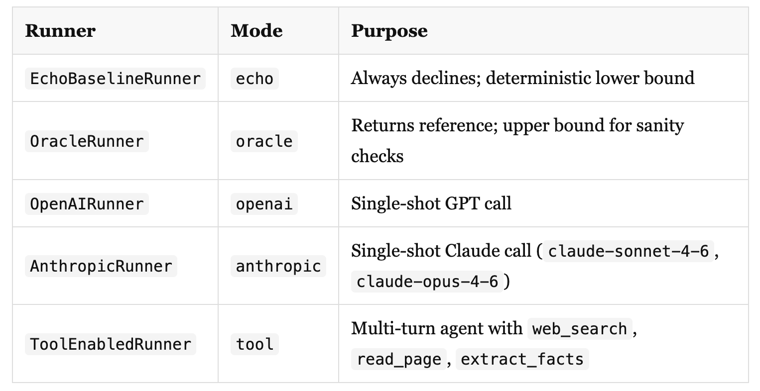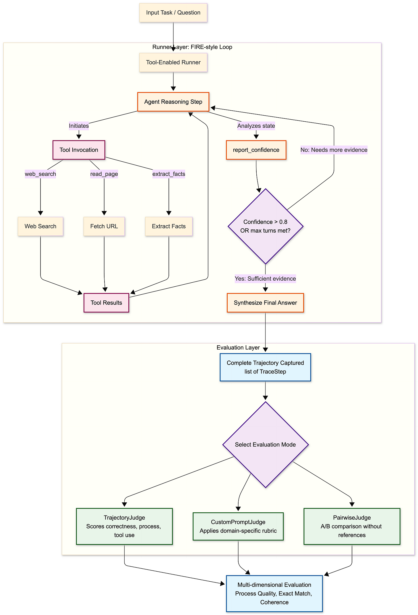 The most interesting component for evaluating agentic behavior is the tool-enabled runner. The design directly follows FIRE’s “verify-or-continue” pattern.