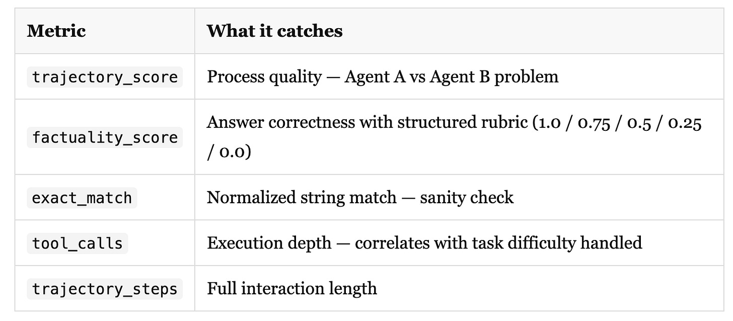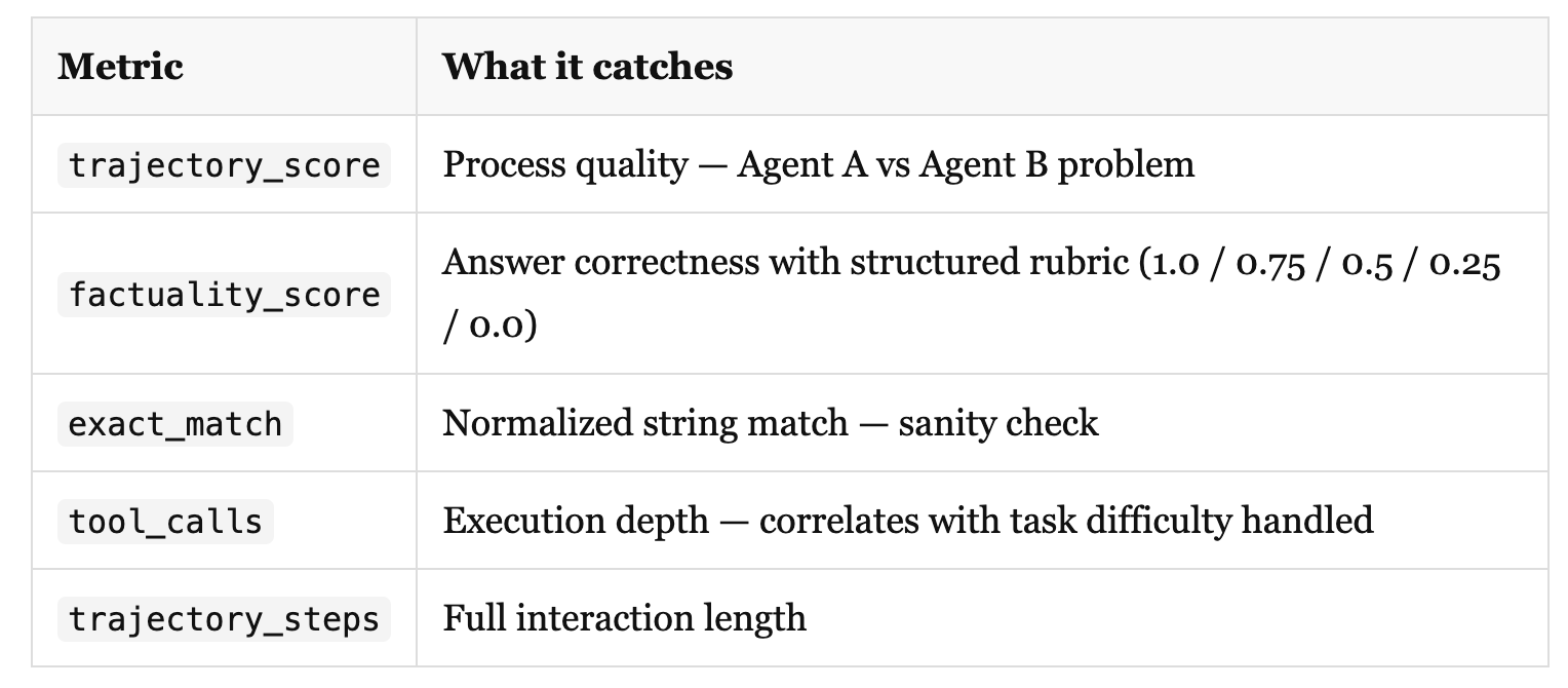 The gap between trajectory_score and exact_match is diagnostic. Large gap with high trajectory score: the agent is reasoning well, but not matching the reference format. This is a post-processing or prompt problem, not a capability problem. High exact match with low trajectory score: Agent A, you got lucky, and you should be worried about it.
