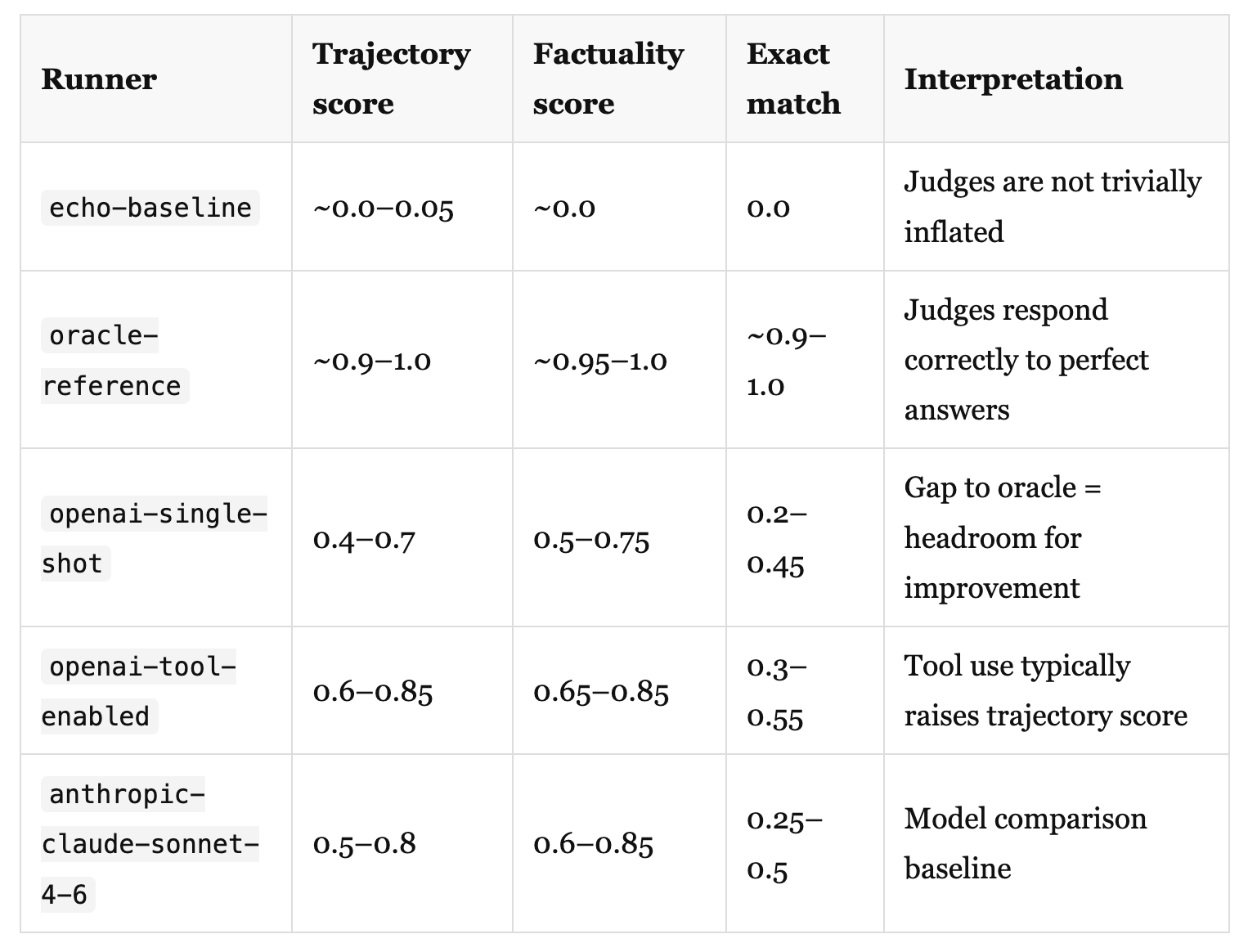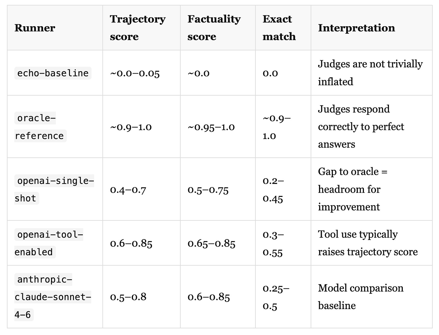 Running the echo and oracle baselines first is not optional. Before trusting any score from a real agent, you need to confirm that your judges are not trivially giving high scores (echo should be near zero) and that they respond correctly to a perfect answer (oracle should be near one). Any deviation from this means your judge is miscalibrated before you even start.