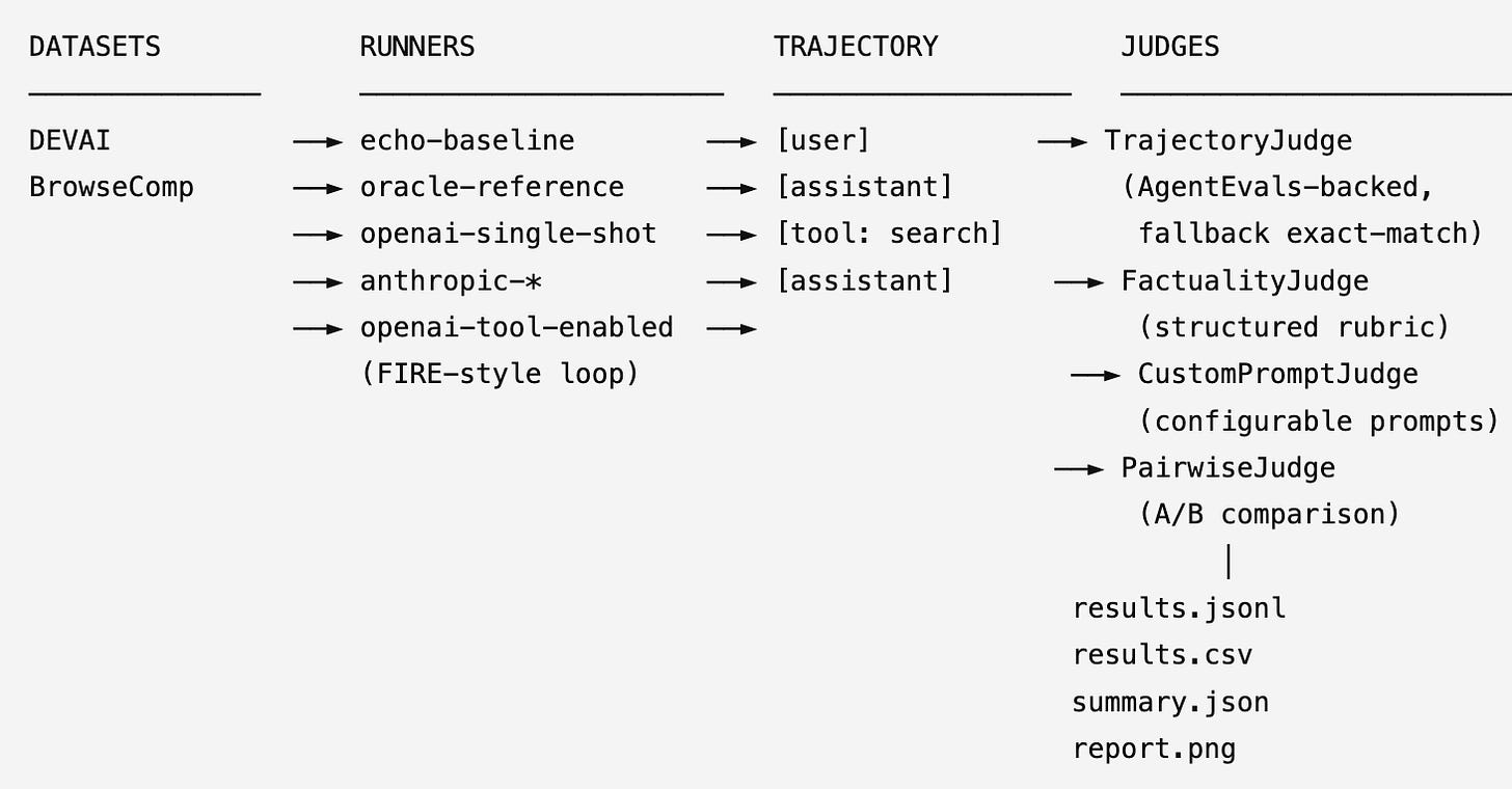 tool_calls: list[ToolCall] = Field(default_factory=list)All runners produce list[TraceStep], all judges consume it. This typed interface makes it straightforward to swap agent implementations without touching the evaluation logic, and to swap judge implementations without touching the runner.